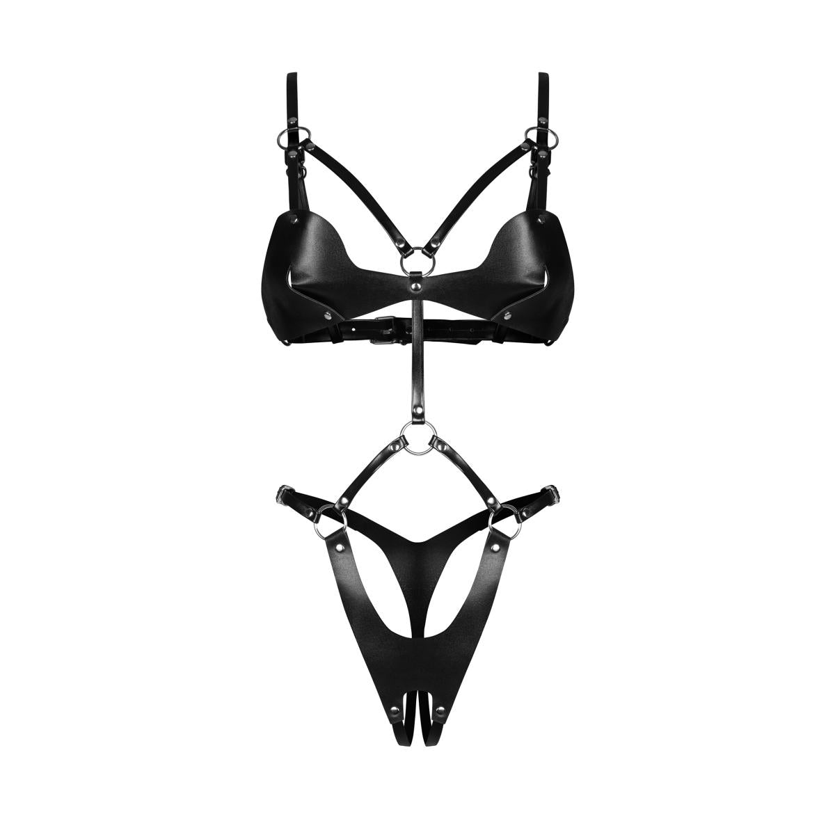 Herätä esiin oma itsevarma viettelijäsi Dame Control -crotchless teddyssä. Kiiltävä musta tekonahka ja näyttävät hopeiset yksityiskohdat luovat rohkean ja samalla tyylikkään ilmeen. Niittikoristeet lisäävät asuun asennetta, kun taas säädettävät hihnat varmistavat, että teddy istuu täydellisesti ja korostaa vyötäröä ja lantiota juuri oikeista kohdista.