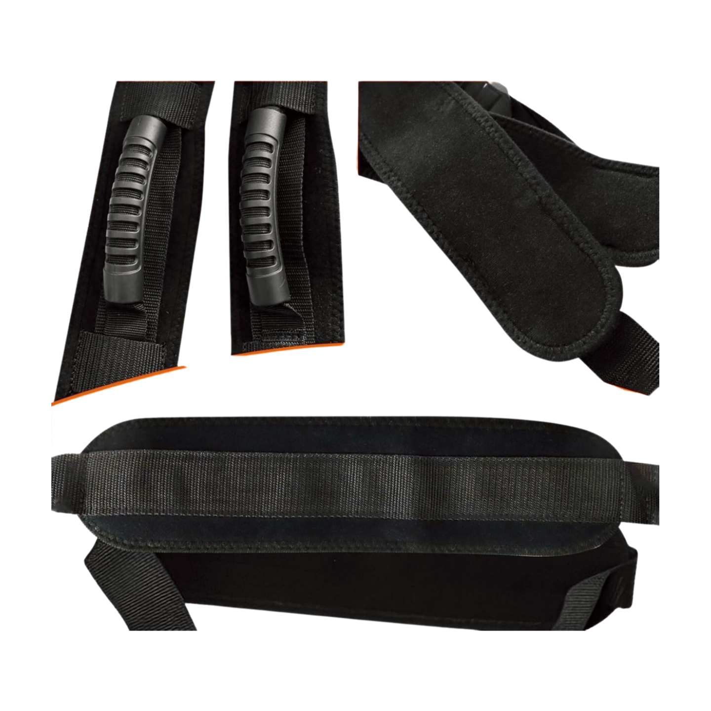 - Materiaalit: Nailonhihnat, pehmeät pehmusteet, kumikahvat