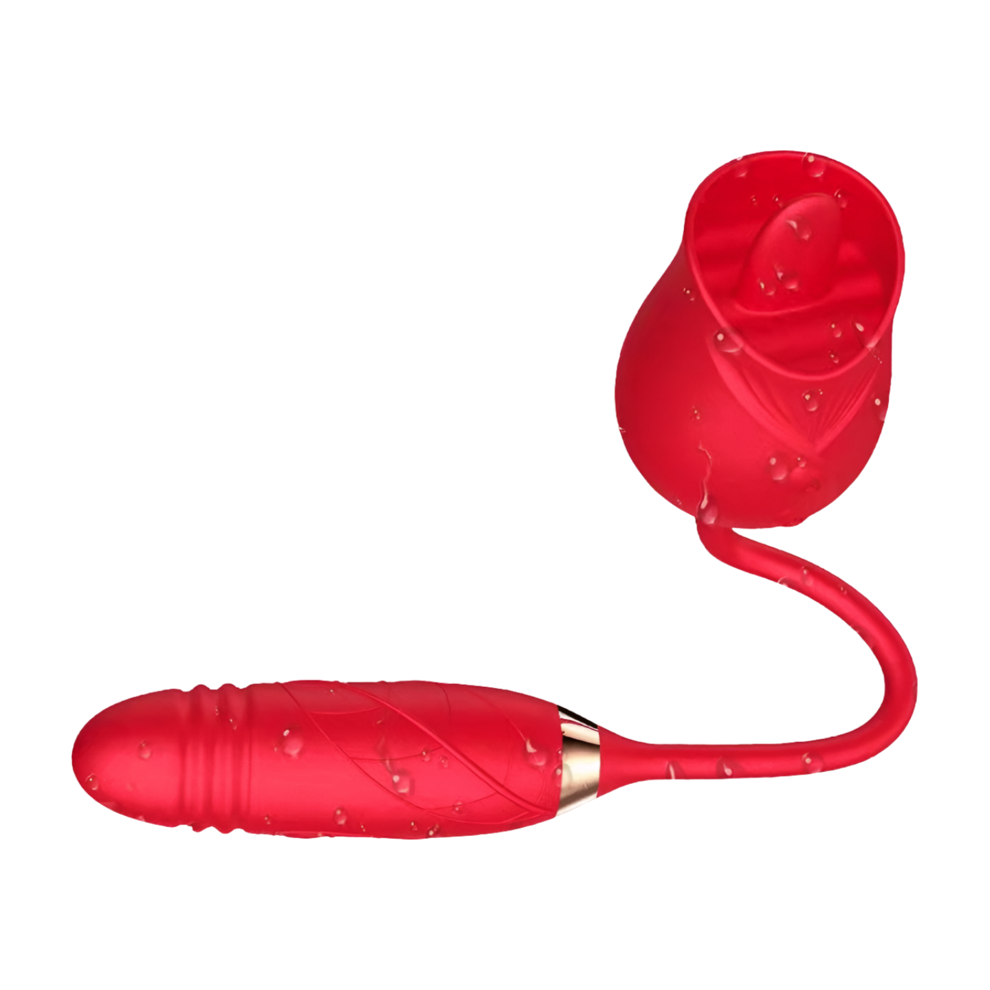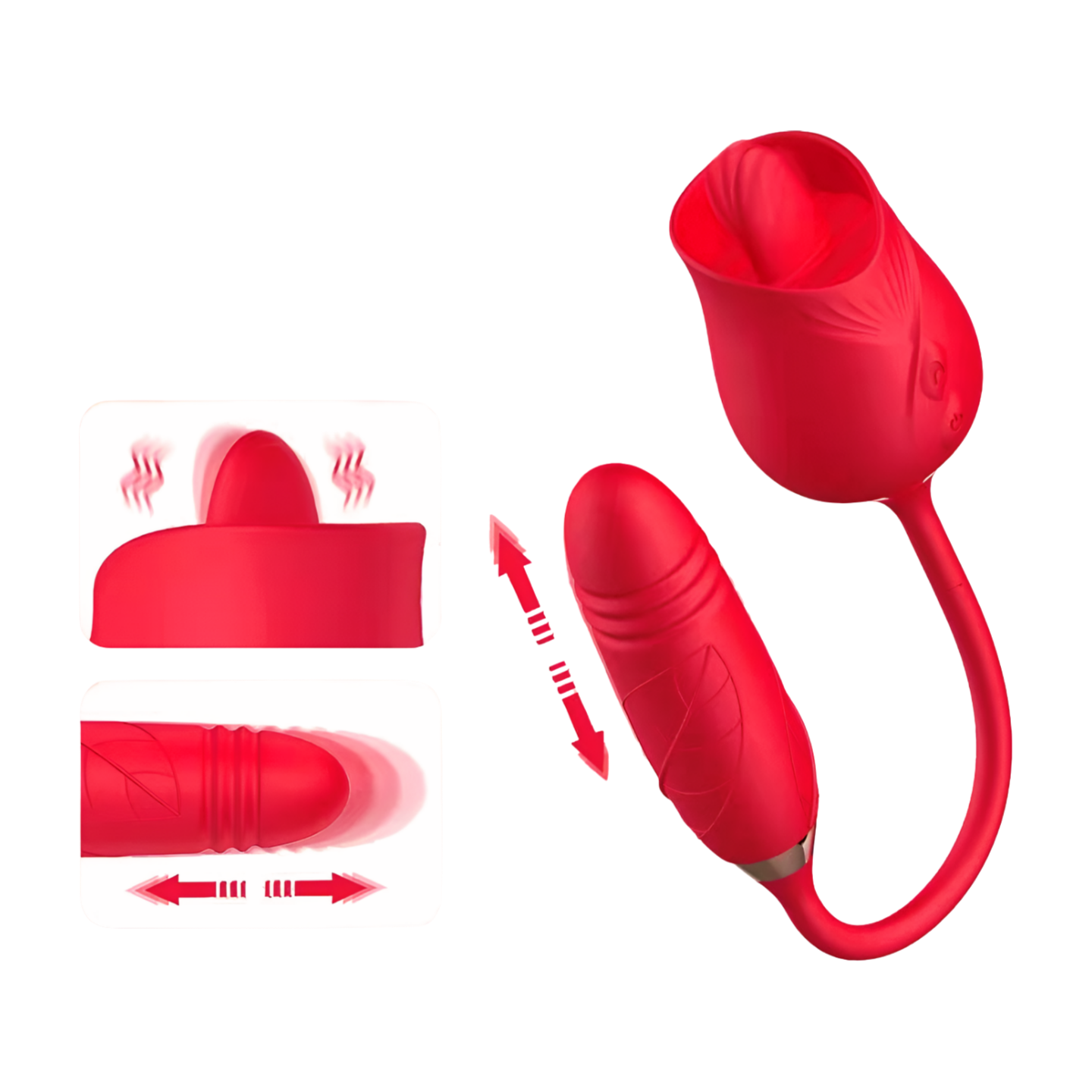 Tämä punainen ruusu vibraattori yhdistää nuolevan kielen ja sisäisen työntö toiminnon yhteen laitteeseen. Ruusu stimuloi ulkoisesti 10 eri lick-tilalla, kun taas sauvaosa tuottaa rytmikästä sisäistä työntöliikettä. Pehmeä silikoni ja joustava rakenne tekevät käytöstä miellyttävää, tehokasta ja helppoa – täydellinen sekä yksin nautiskeluun että lisämausteeksi kumppanin kanssa.